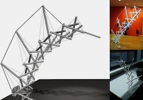 Tensegrity structures have fascinated designers since they were invented by Kenneth Snelson in the 1940s. Robbert Spikman, studying Industrial design at the Technical University Eindhoven in the Netherlands, designed this LED desk lamp using a tensegrity tower, and made from paper structural members (with the help of the step-by-step instructions from Ropes and Poles).